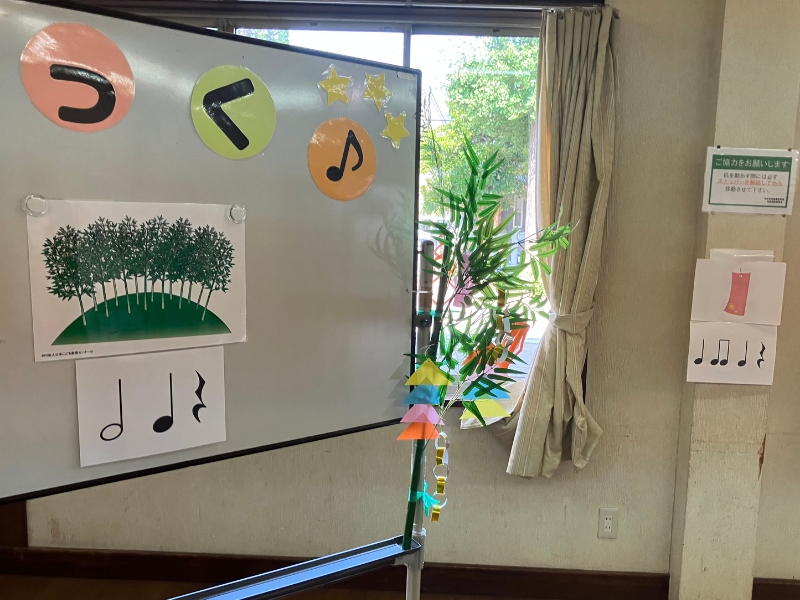 短冊に願い事を書いて飾った後は、「たんざく」「あまのがわ」「ささ」と言葉をつけてリズムの違いを聴き分けます。