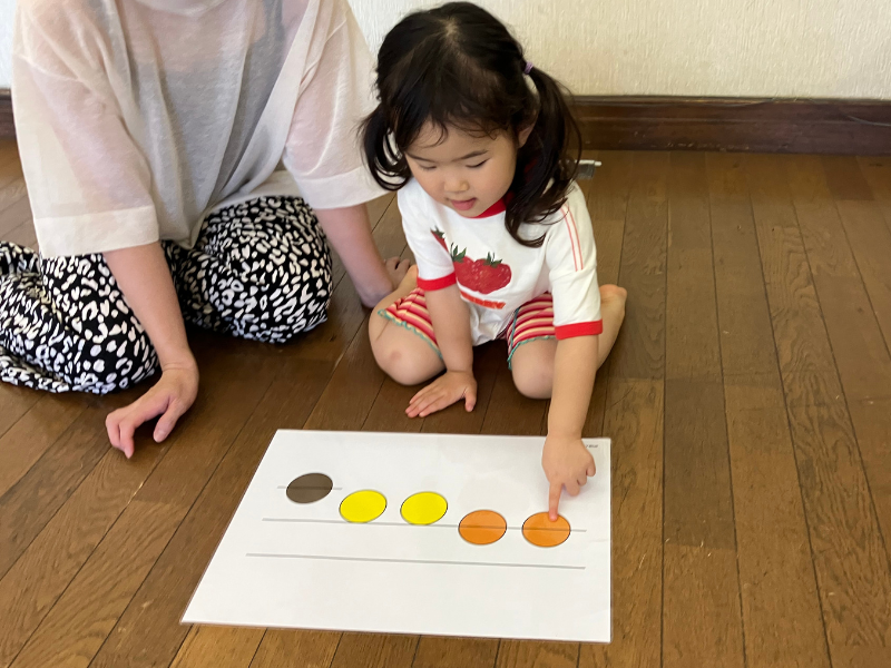 先生の即興ピアノを聴いて、どの音符が鳴っているのか、聴き分けしたりステップしたりできるようにもなります。